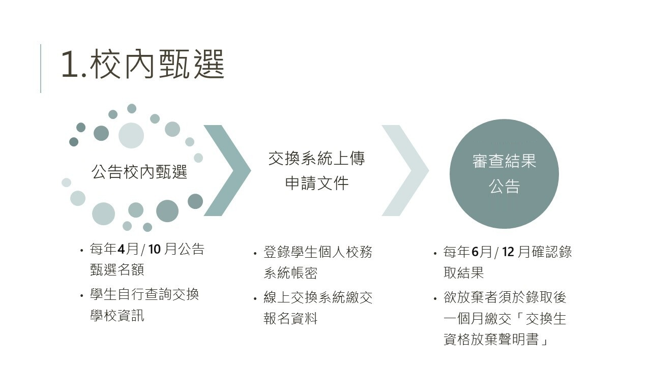 交換學生計畫建立在與姐妹校平等互惠的原則下,簽訂協議,互相提供出國及來校進行短期、非學位的學習機會。學生前往姐妹校研修一學期或一學年,身分等同該校學生,所修學分可互相採認,以提供兩校學生實質的交流機會。欲參加本校交換學生計畫,須先申請出國交換生甄選以取得本校推薦資格,並於下一學期檢送申請資料至姐妹校審核。校內各院、系、所亦有基於不同協議之交換計畫,由各院、系/所自行辦理甄選,詳情請逕洽各院系辦公室。